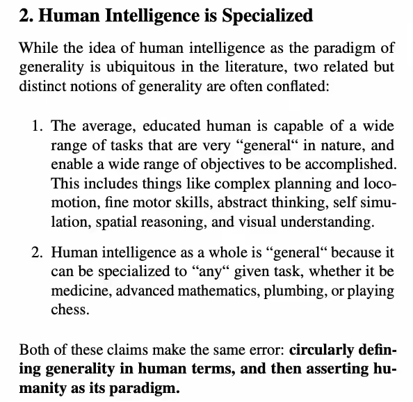 在当前的 AI 热潮下,有这么一个反调,反而给了很多灵思,核心洞察其实并不新鲜,有没有特别强的干货,更多是一种思想实验。「人类不通用」「专精比全能更实际」这些观点在认知科学和进化生物学中有普遍共识。但论文的价值在于,它把这些观点系统地整合起来,对准了 AI 领域当下最热闹也最混乱的 AGI 叙事,提供了一个更务实的思考框架。 有一些可以商榷的地方。比如,论文对 AGI 定义的批评虽然条理清晰,但在某种程度上也没有讲清楚问题到底在哪:并非所有使用 AGI 这个词的人都真的相信「无所不能」的字面意思。很多时候 AGI 更像是一个方便的简称,指的就是「比当前 AI 强得多的下一代 AI」。另外,SAI 的定义里留下了开放问题,作者自己也承认没有给出精确定义。 SAI 还不是一个完美的理论体系,但至少它提醒了我们:与其争论 AGI 到没到、什么时候到,不如想清楚我们到底希望 AI 变成什么样。