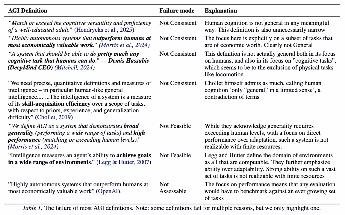 结果大多数定义都至少在一条上不及格。比如,声称覆盖「所有可计算任务」的定义在「No Free Lunch」定理面前站不住脚;以人类为参照的定义又自相矛盾——如果人类本身不通用,那「达到人类水平的通用智能」就是个伪命题。
