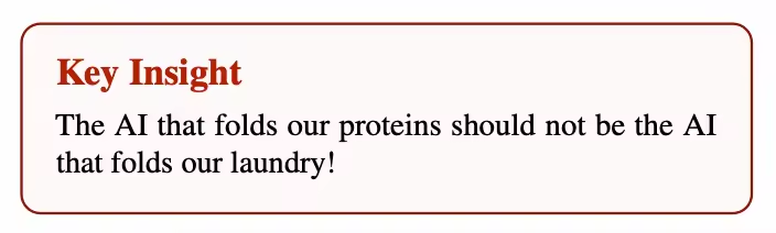 论文用了一句很好记的话来总结:「折叠蛋白质的 AI 不应该是折叠衣服的 AI。」 AlphaFold 之所以能在蛋白质结构预测上取得突破,恰恰是因为它把所有的设计、数据和训练精力都集中在这一个问题上。如果要求同一个系统既能预测蛋白质结构又能叠衣服,两边的性能大概率都会打折扣。