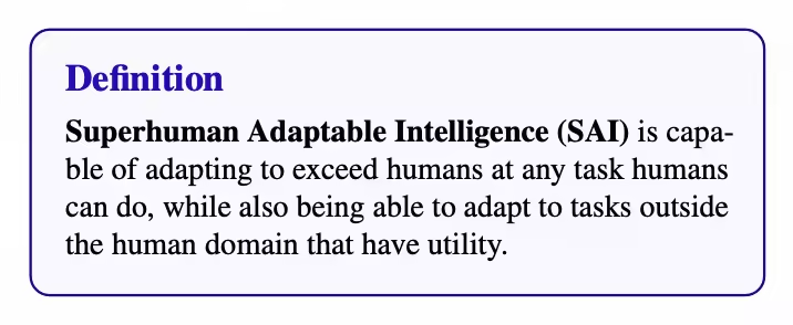 在批评完 AGI 之后,论文提出了自己的替代方案:超人类适应性智能(Superhuman Adaptable Intelligence,SAI)。定义大致是这样的:SAI 是一种能够通过适应,在任何人类能做的重要任务上超越人类,同时也能适应人类能力范围之外的有用任务的智能。